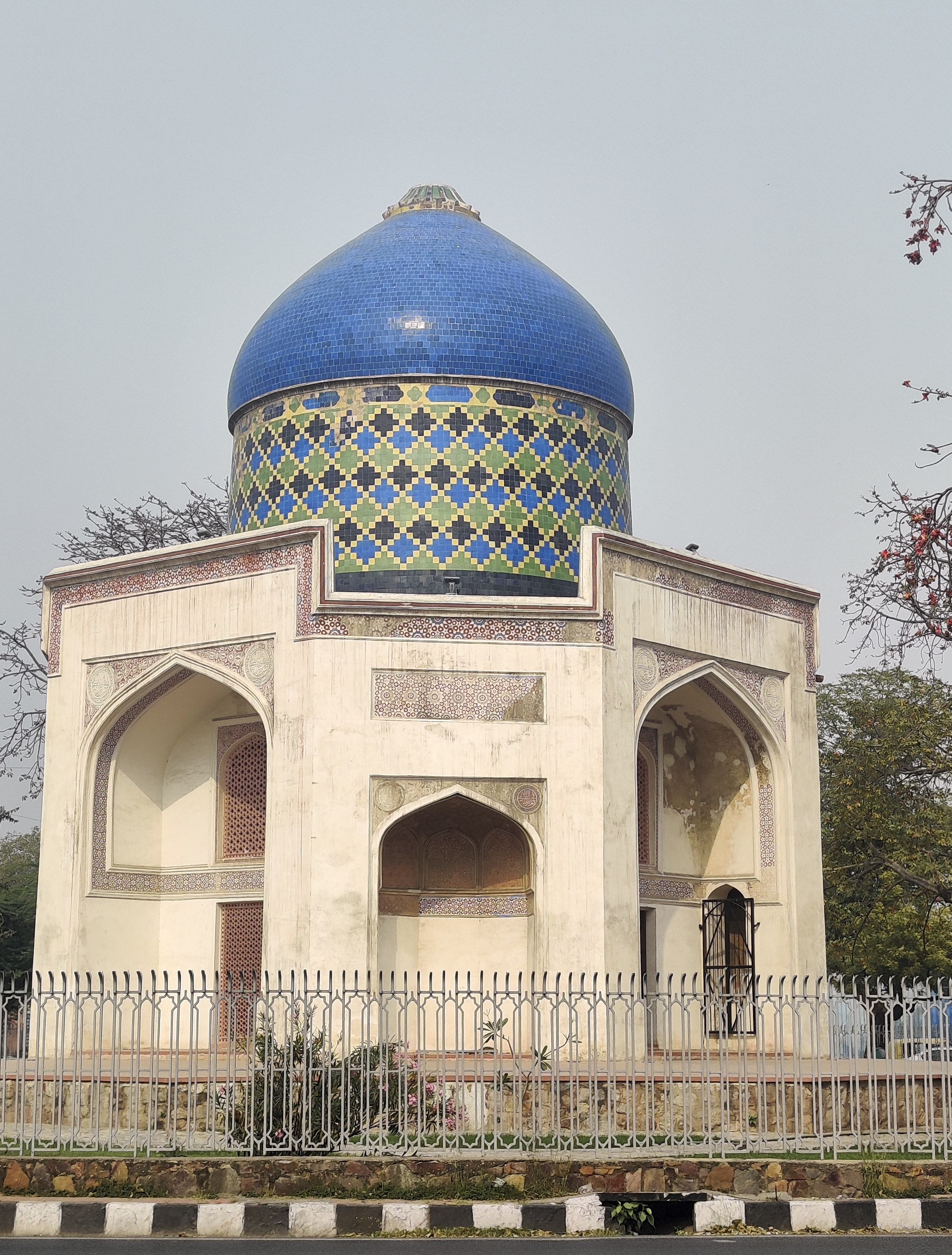 Latticed Screen / Jaali at the Sabz Burj, Nizamuddin (views inside and outside). Cut the glare and yet illuminate the space. Cut the gaze yet maintain the aperture view. Cut the heat and humidity and yet let the breeze filter in and cool the high-ceiling space. When the air passes through a drilled pattern of the jaali its velocity increases thus improving the cooling efficacy. And the geometric pattern creates a lovely play of light and shade inside.