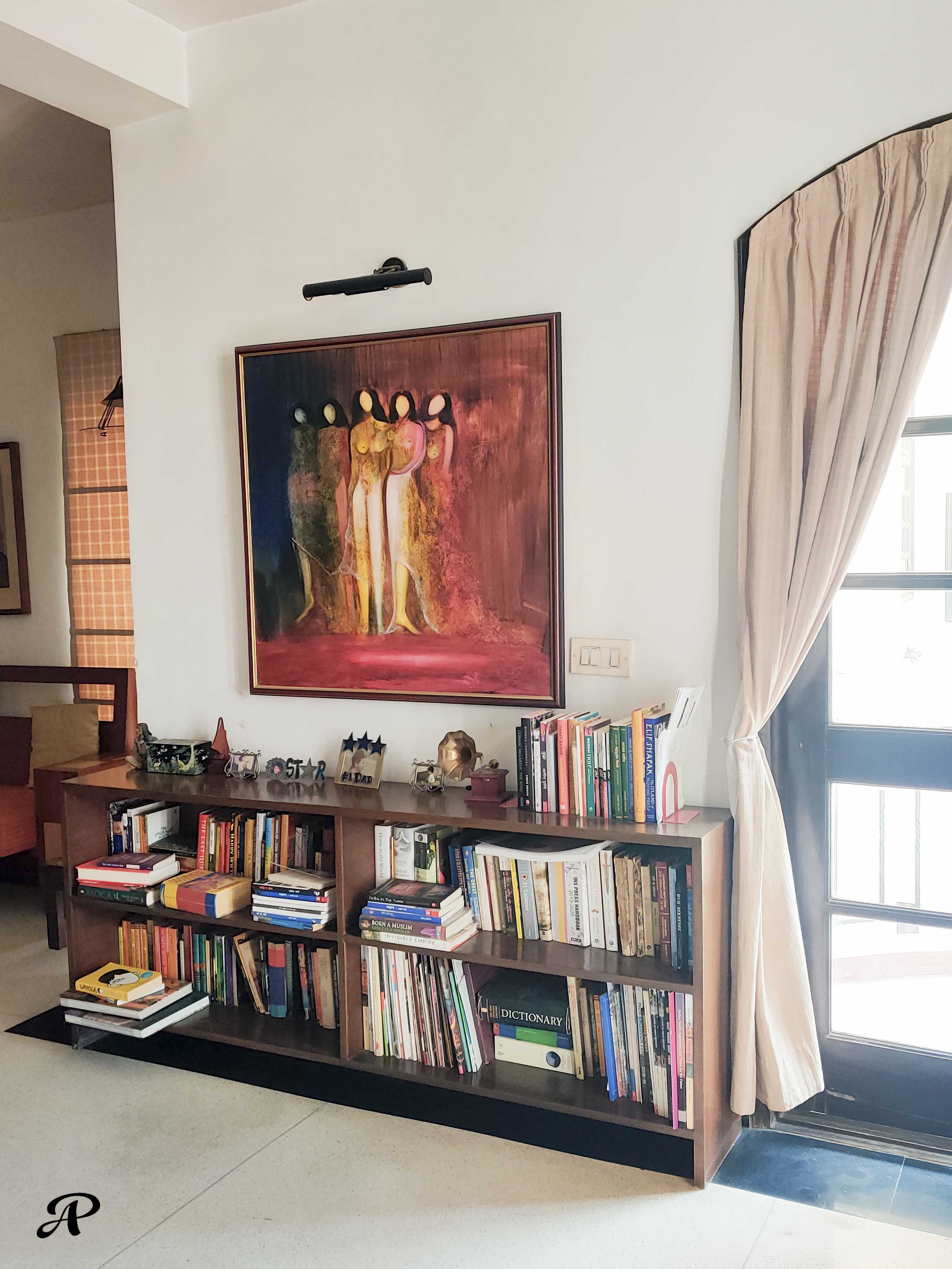 I look up at the painting again. The position of their faceless heads has changed. I am sure the heads are closer together. They are bending to where the ears should be. I can hear them whisper. It is distinct, they are talking… for sure. Anyone else would have vouched for it, would have heard them. I am petrified, scared shit. There is a distinct sound of anklet bells, ghostly echo, soft, tingling sound of छन्न … छन्न … छन्न and then the notes come again ‘…आँधियाँ वो चलीं, आशियां लुट गया, लुट गया… एक छोटी सी झलक, मेरे मिटने तलक, ओ चाँद … ओ चाँद मेरे दिखला जा…’ A crescent-moon-like male face appears on the top left corner of the canvas and disappears, as if hiding from someone