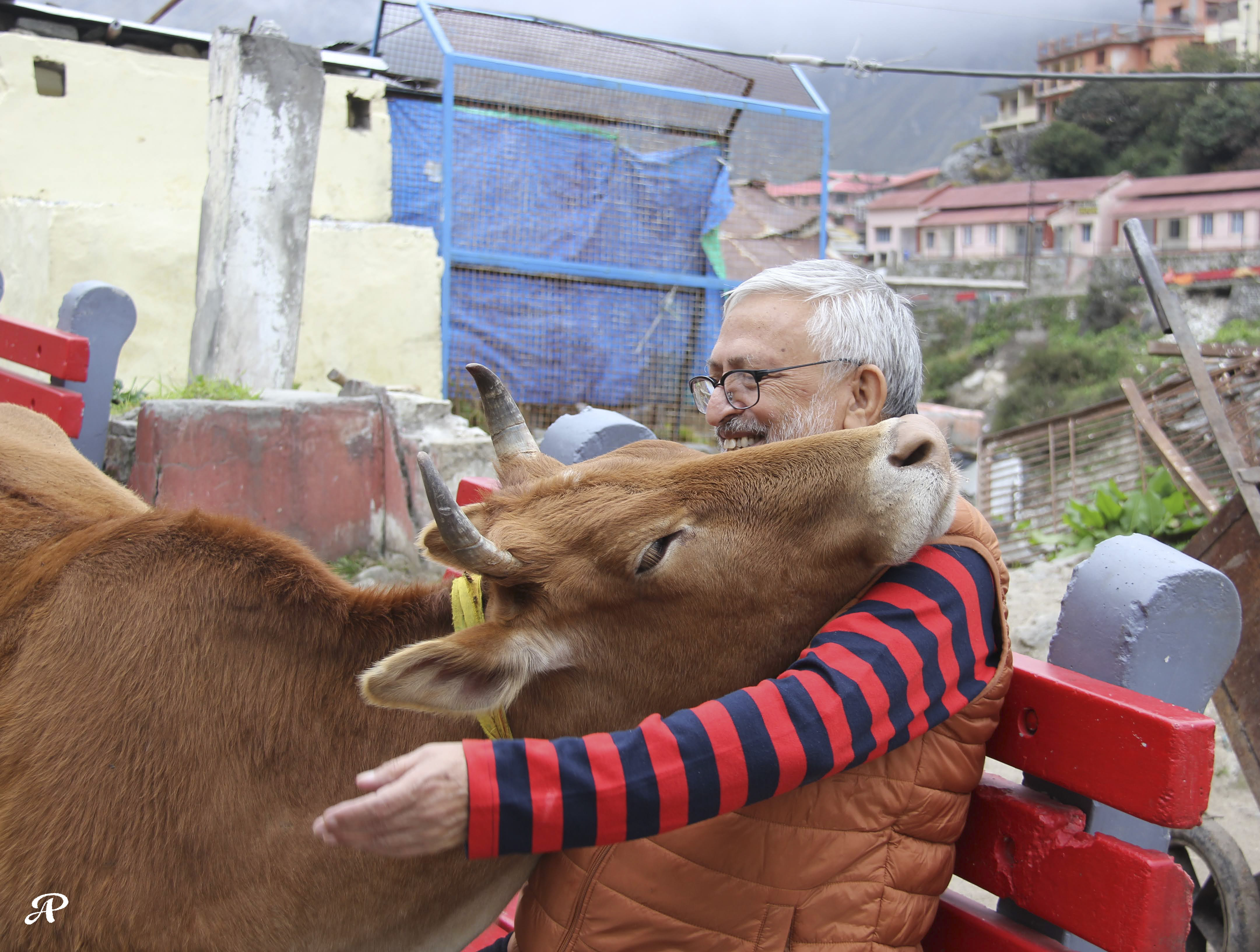In picture: This dramatic moment happened in October 2022 at Badrinath Dham, Uttarakhand. A cow came and simply hugged Govind Pant and stayed there for sometime in that position