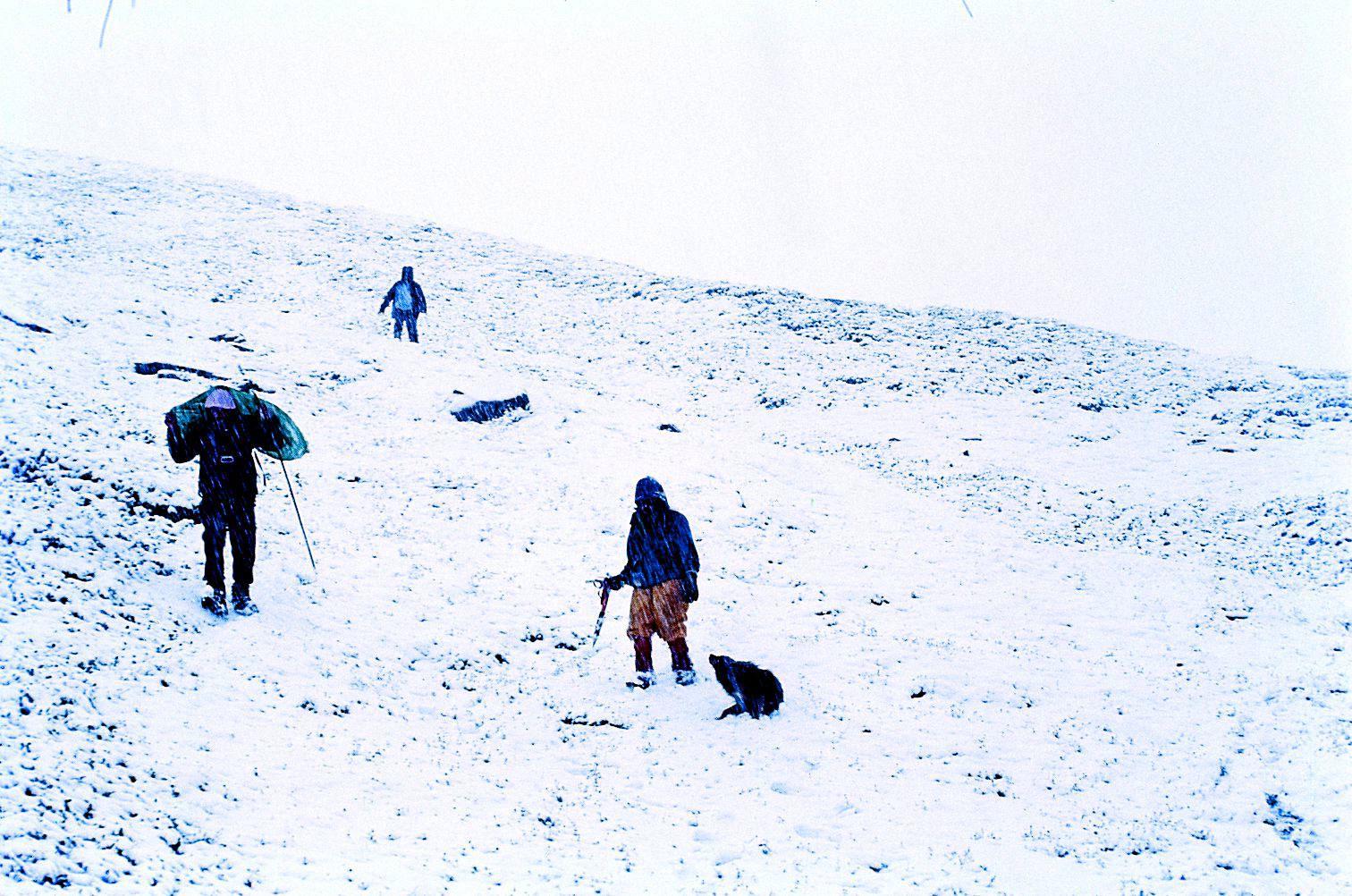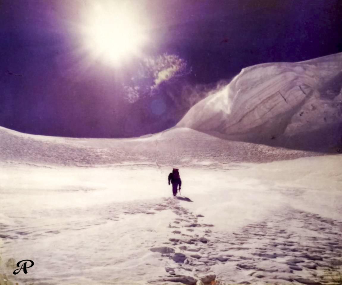 In the third picture the shining object that you see in the dark skies is actually the ‘full moon’ to the left of the eastern shoulder of Nanda Kot peak. The wind was picking up in the early hour. You can see the snow-drift just below the Col and the distinct footprints of the advance party being covered by fresh snow. The approach to the Nanda Kot summit is from behind this Col ascending the ridge on the right side. This picture was taken at about 3 am just after starting for the summit attempt.