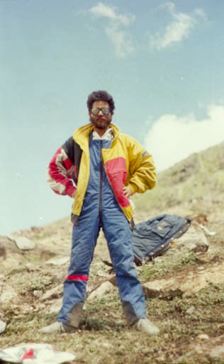 Posing solo in dungarees and a ski-jacket, with sunburnt face and flaking lips covered with beard, is yours truly doing a ramp act after the summit was successfully climbed on the 16th day.
