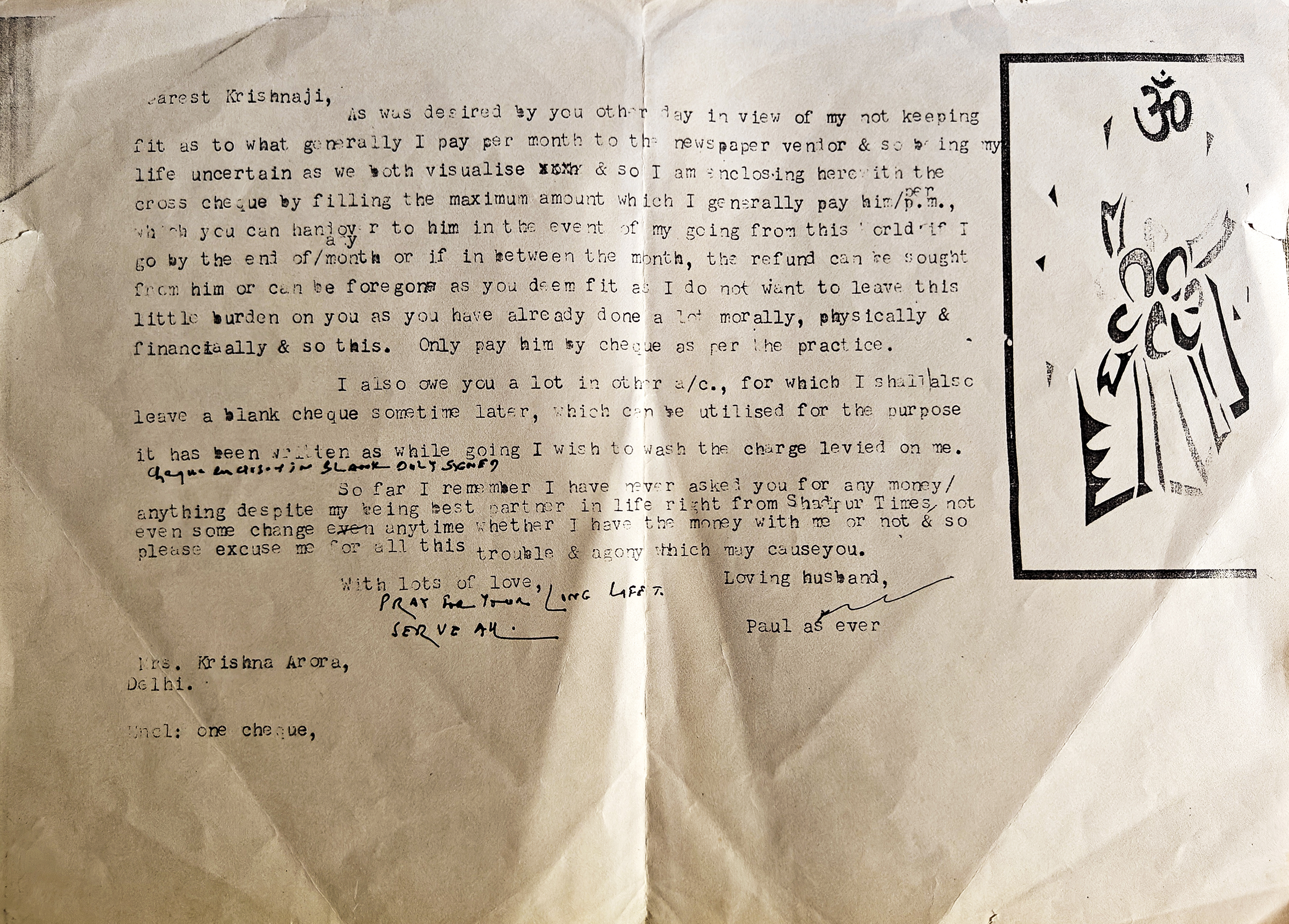 As was desired by you (the) other day in view of my not keeping fit as to what generally I pay per month to the newspaper vendor & so being my life uncertain as we both visualise & so I am enclosing herewith the cross cheque by filling the maximum amount which I generally pay him per month’ which you can handover to him in the event of my going from this world. If I go by the end of any month or if in between the month, the refund can be sought from him or can be foregone as you deem fit as I do not want to leave this little burden on you as you have already done a lot morally, physically & financially, and so this. Only pay him my cheque as per the practice.