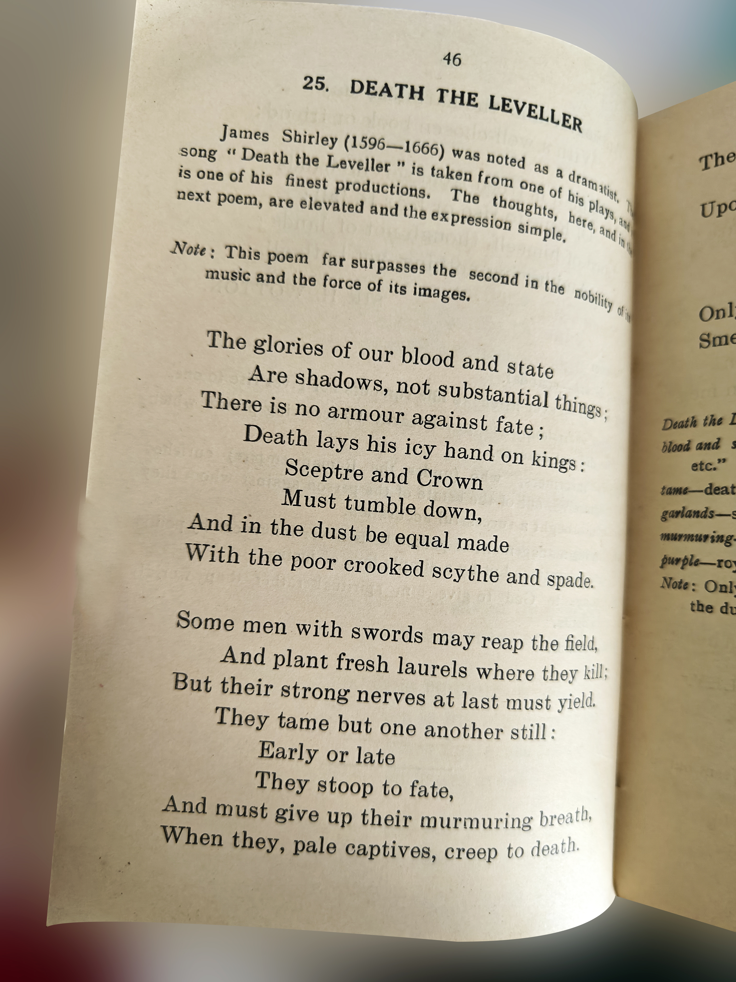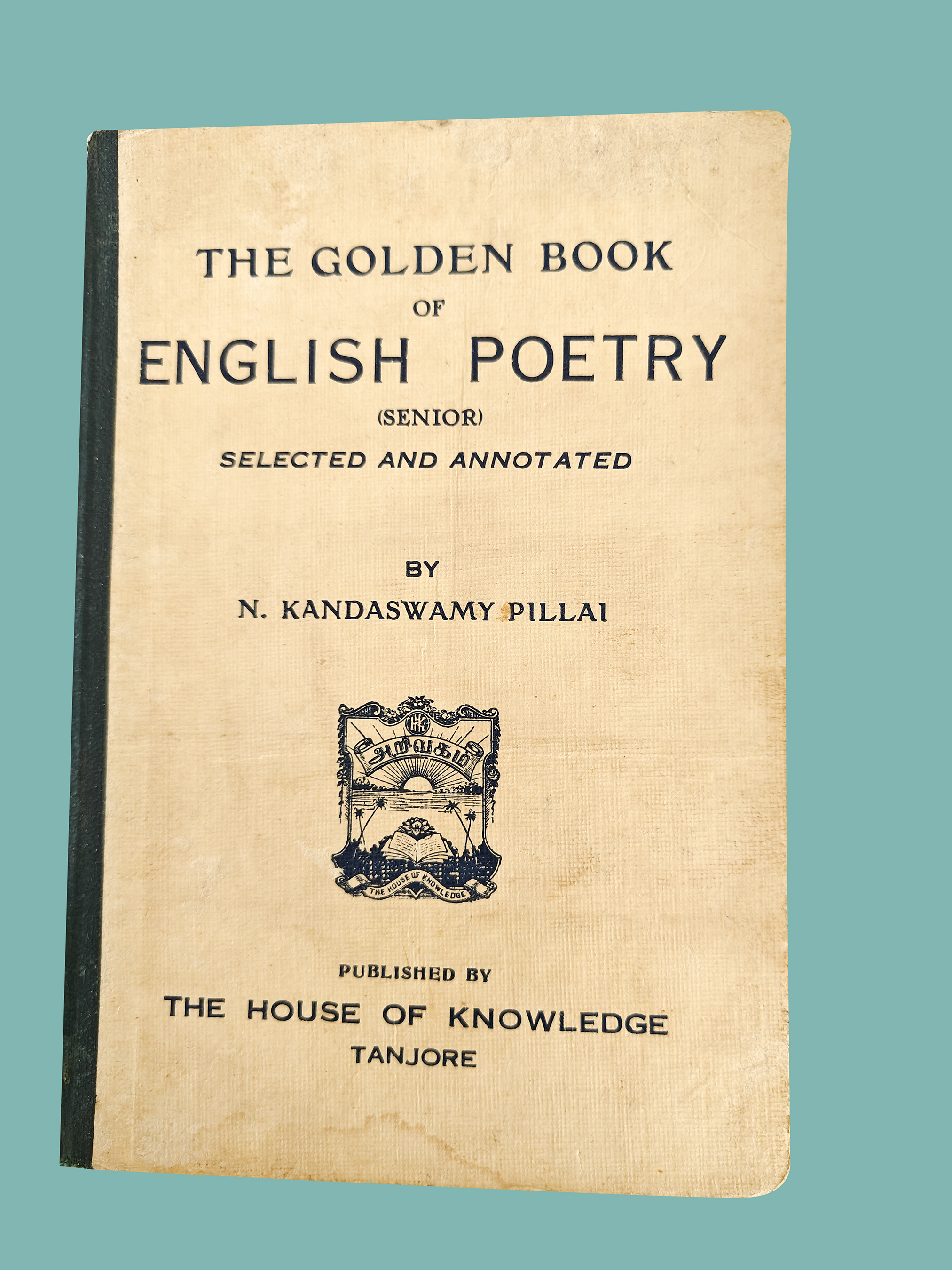 Published in 1933, The Golden Book of English Poetry, Selected and Annotated by N. Kandaswamy Pillai, the anthology was a part of curriculum for students of schools in Madras Presidency. The anthology has poems from 58 poets as diverse as Lord Macaulay to John Keats. At the head of each poem is a brief note on the author and a line or two of comments. At the end of the poems there are Notes, ‘to words, phrases and terms unfamiliar to students’. The book also has 11 ballads. The Editor in his preface says, “Tennyson and Victorians have been excluded…” in a hope to bring out a companion volume to this. Published by The House of Knowledge, Tanjore the book doesn’t mention its price or, maybe a page is missing from this antiquarian volume (I love their colophon). This well preserved copy, that I recently bought from a dealer, was originally owned by one J. S. Sowmianarayanan possibly a student or even a teacher.