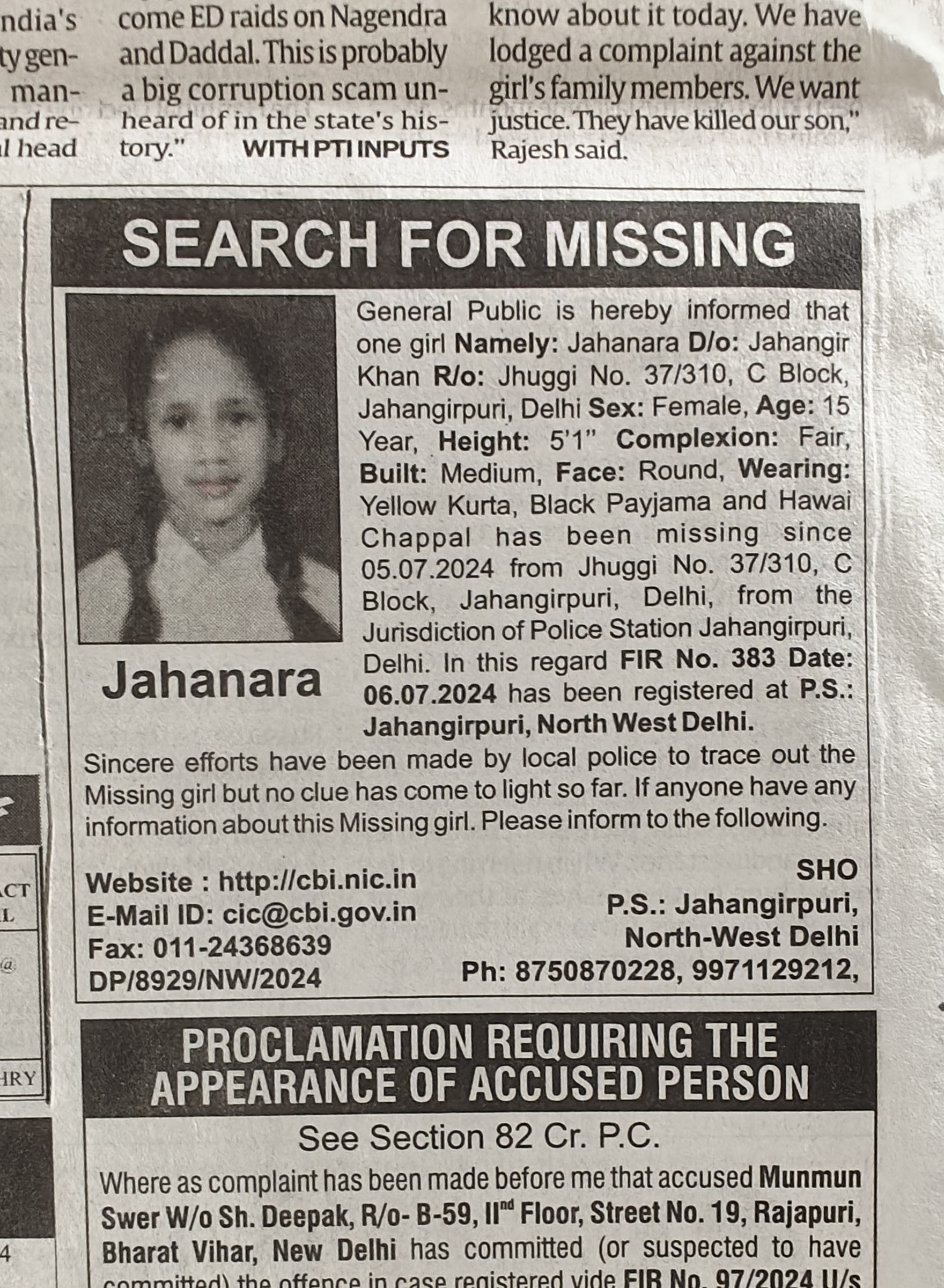 जहाँआरा वल्द ज़हाँगीर दिल्ली के जहांगीर पुरी इलाके में रहती थी। उम्र 15 साल, रंग साफ़, गोरेपन की तरफ, गोल चेहरा, गठा जिस्म, सुन्दर सी दो चोटियां बनी हैं, पीला कुरता, काला पजामा और हवाई चपल पहने अपने घर के पास से 5 जुलाई से लापता है। पुलिस ने पूरी तहक़ीक़ात करने के बाद इश्तिहार दिया है। पर सोचिये अब अगर पुलिस को ही नहीं मिल रही तो जनता को कैसे मिलेगी ?