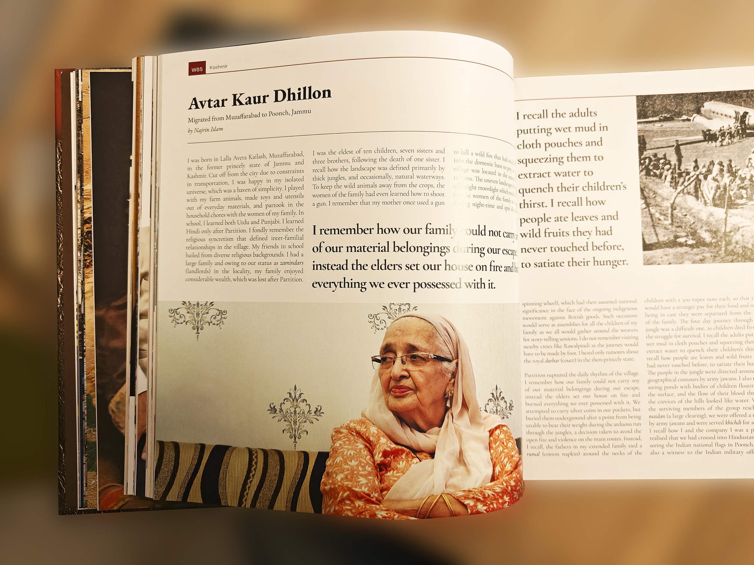 मुझे सब साफ़ साफ़ याद है। हमारा परिवार भागने के दौरान अपना कोई भी सामान नहीं ले जा सका, इसके बजाय बुजुर्गों ने हमारे घर में आग लगा दी और हमारे पास जो कुछ भी था उसे जला दिया। मुझे याद है कि बड़ी उम्र के लोगों ने अपने बच्चों की प्यास बुझाने के लिए गीली मिट्टी को कपड़े की थैलियों में रख उसमे से निचोड़कर पानी निकाला । हमारे पास खाने के लिए कुछ नहीं था। मेरी दो बहनों की पुंछ में मौत हो गई। कई लोग भूख से मर गए और बच्चे दूध की कमी से मर गए।
