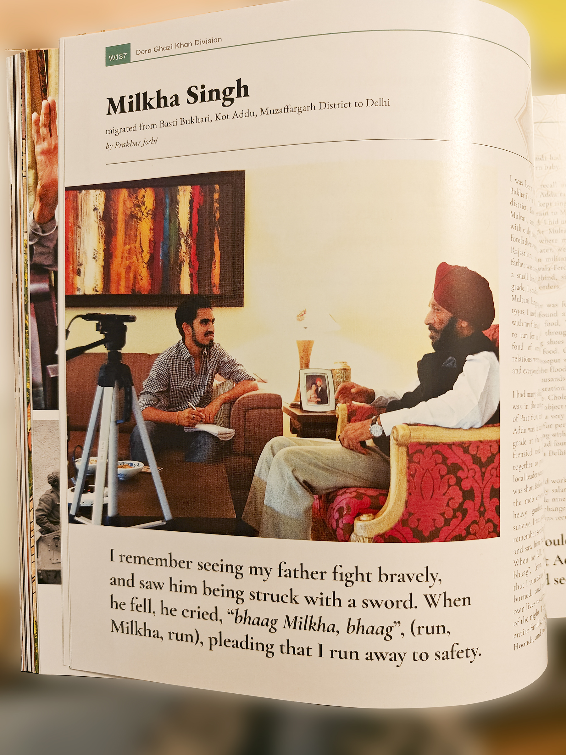मैंने अपने पिता को बहादुरी से लड़ते हुए देखा और मुझे उन पर तलवार से हमला होते देखना याद है। जब वह घायल हो कर गिर गए, तो वह चिल्लाये, “भाग मिल्खा, भाग”, ये कहते हुए हुए कि मैं अपनी हिफाज़त के लिए भाग जाऊं।