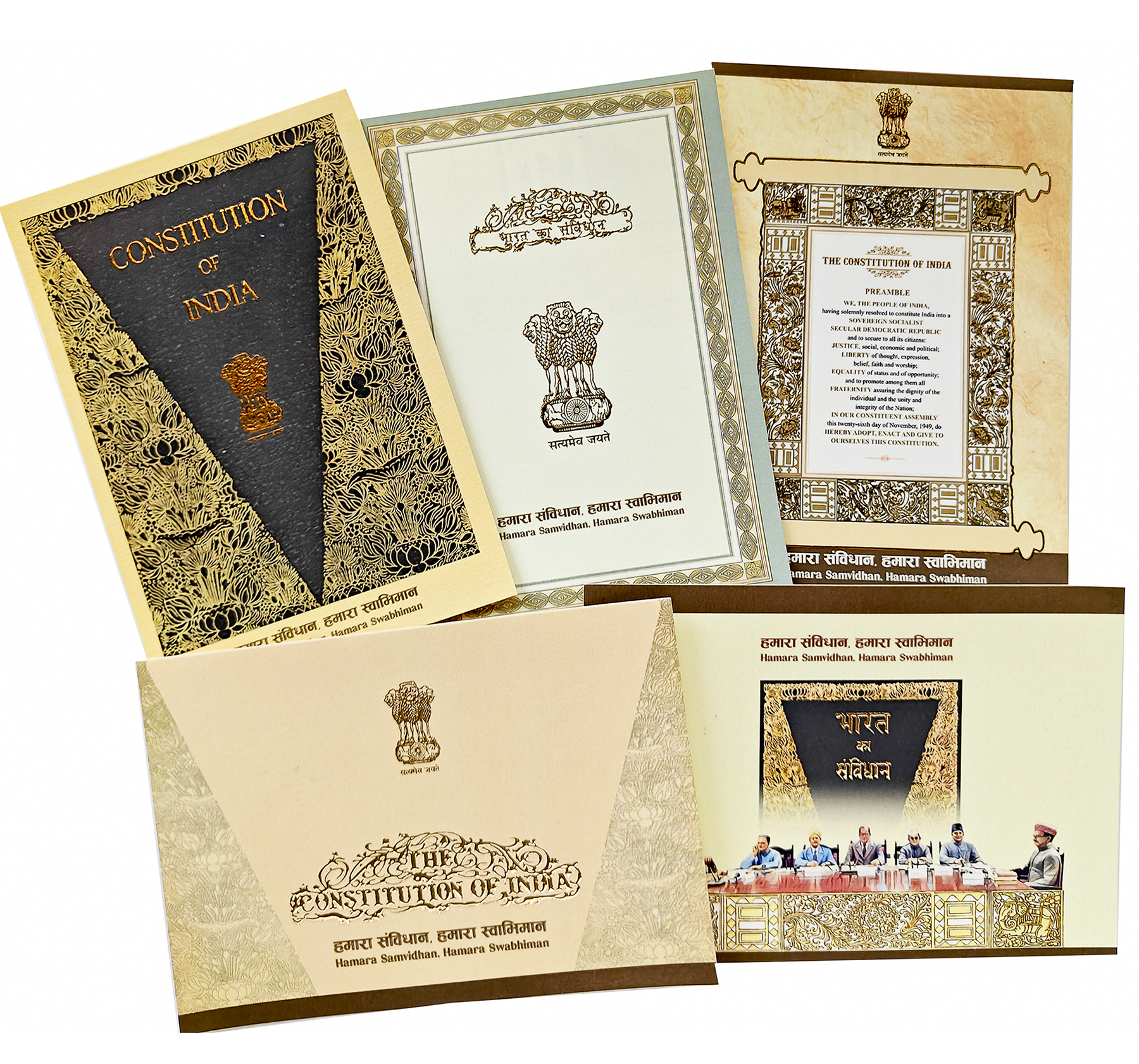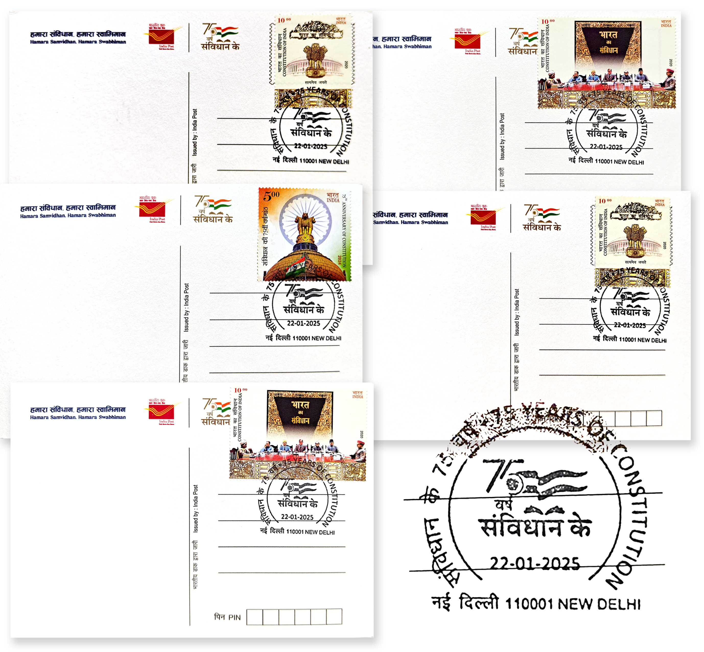 India Posts has issued a set of five special postcards on 75 Years of Constitution with a Special Cancellation dated 20 January 2025. This special Postcards set (6×4 in) comes in an elegant box (sturdy, magnetic latch) for collectors. The five postcard set has Constitution of India stamps valued 45 Rs cancelled on the (three stamps issued earlier in 2020). Thankfully, one of the stamps has the illustration of the original Parliament building The box and the postcards have golden-leaf-embossing together with illustrations from the original copy of the Constitution. Rs. 300 only. Difficult to say these days, what will last, grab them.