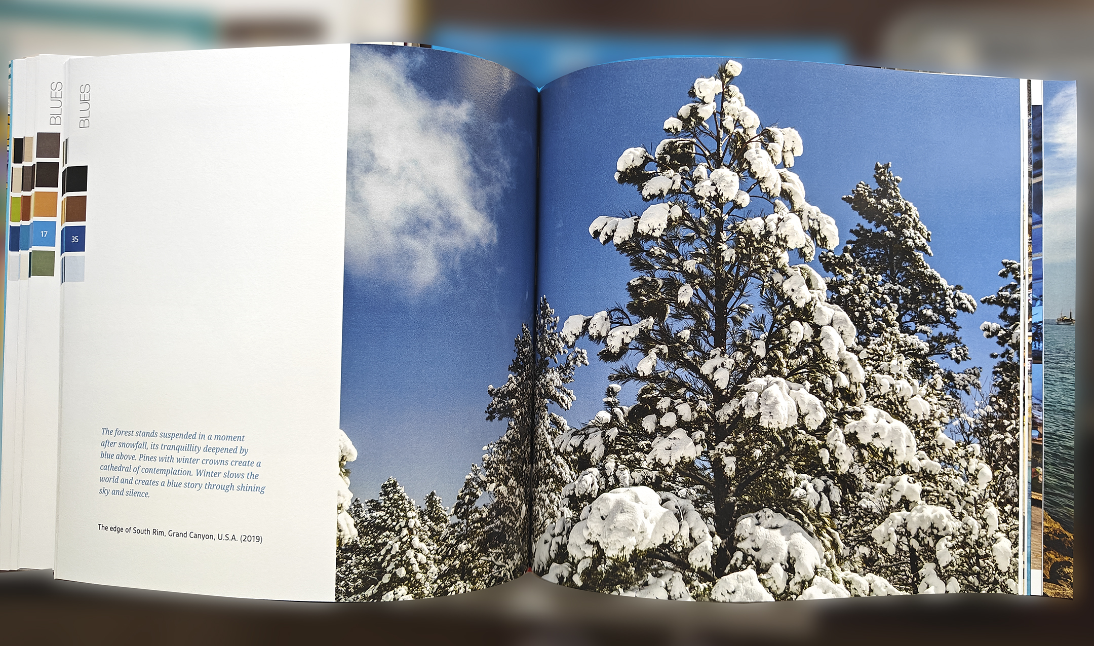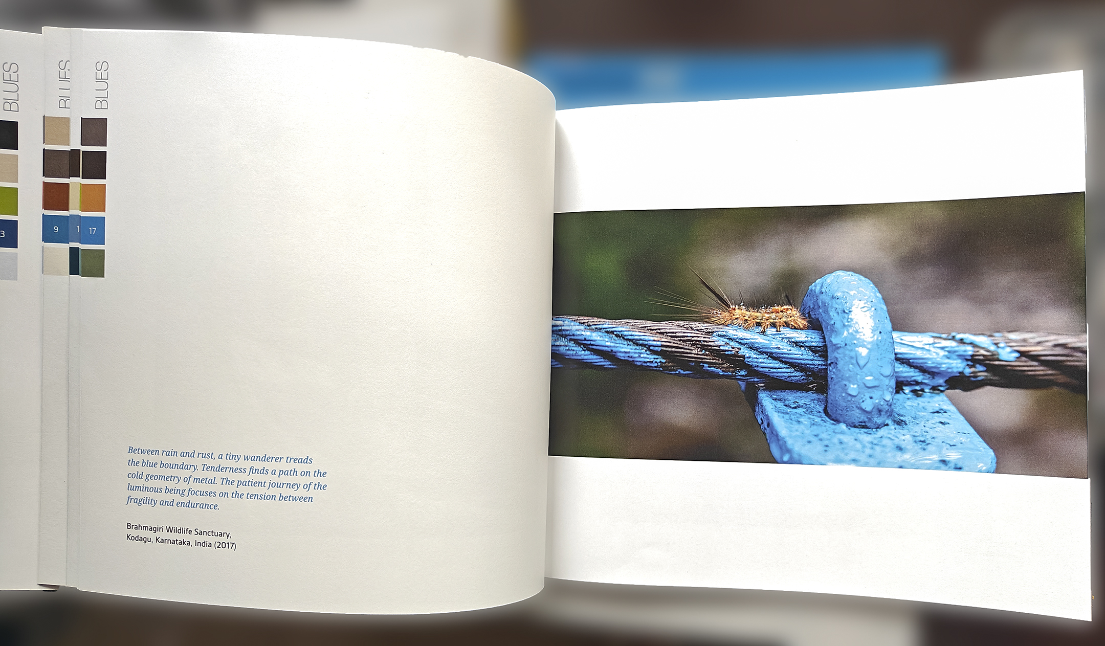 Stretching across the wide spectrum of blue, Dr Kausik Ghosh’s photos drape us with tones that soak away the blues. Precisely, their blue tempts us, soothes us and balms our eyes with that such heavenly tints that dispel the distress. His pictures goad us not only to look up to the sky but also nudge us to pick finer details of blue in nature and objects all around us. The peace and stillness of the blue in his pictures brush aside the sadness and adds stability to our thoughts – precisely what music does. Indeed, there is music in each of his frames. The angelic note of a harp going there, a violin’s note ringing there and a flute blown so close to our earlobes that even the heart tingles. I could see the golden caterpillar ‘glide’ on the painted blue cable, the ice flakes rappelled down the branches of the tree set against the cerulean blue. Whether it was the colour blue in ceramic motifs outside a house or the unending blue tiles running from columns to the domes of Central Mosque in Bishkek, Kyrgyzstan. Each shade of blue brings us closer to the divine touch moving us towards serenity, as if holding our hands and offering the much-needed trust. Â