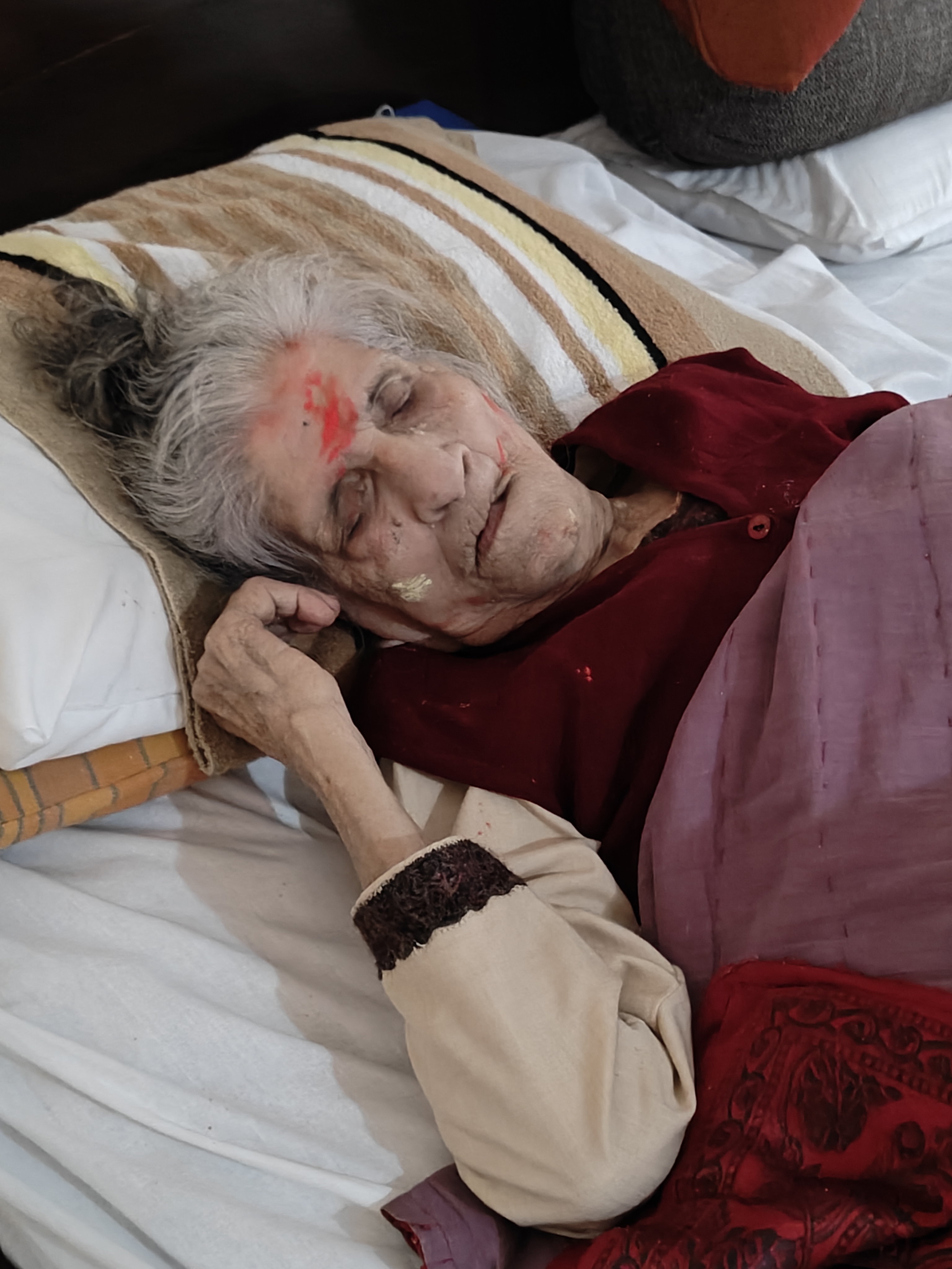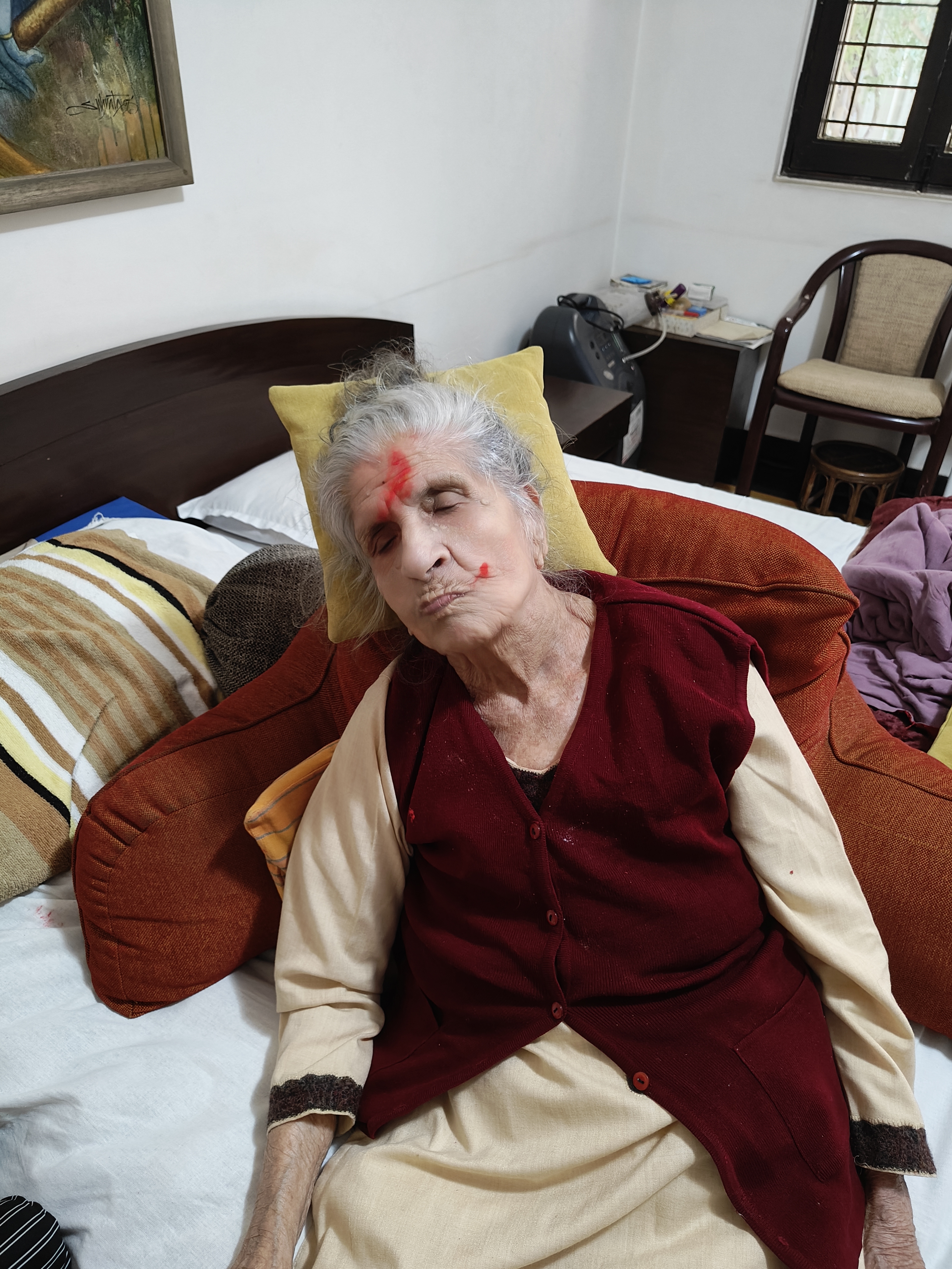 ये तस्वीर होली के दिन की है । एक रात पहले उनकी तबीयत ठीक नहीं थी। उस सुबह भी वो देर से ही उठीं । दोपहर हो चली थी और वक़्त निकला जा रहा था। हम तय नहीं कर पा रहे थे कि उन्हें जगायें या नहीं, रंग लगाएं या नहीं इतने में उनकी पोती चाँदनी ने आ कर माथे पर टीका सा लगा दिया। उन्हें उठा कर बिठाया गया तो भी आँखें बंद कर और सर को पीछे झुका कर माँ कुछ इस तरह से मग्न थीं जैसे शायद कभी अमीर खुसरो रहे होंगे, अपने पीर-ओ-मुरशिद हज़रत निज़ामुद्दीन औलिया को याद करते हुए या फिर खुसरो समा मे रहे होंगे जब उन्होंने “आज रंग है ऐ माँ रंग है री” कव्वाली पहली बार अपने मुरशद के सामने गुनगुनाई होगी। उस रोज़ खुसरो ने खुद को और दुनिया को उस रूहानी रंग में रंगा हुआ देखा होगा जैसे तब मैं देख रहा था। माँ भी समा में ही थीं – दुनिया-जहान से बेसुध, बेखबर – ऐसी बेखबर कि उन्हें मेरी आवाज़ “आज रंग है री” भी नहीं सुनाई दी ।